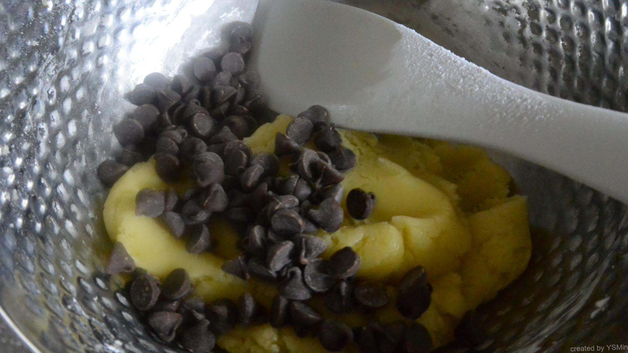 버터 50g, 설탕 75g, 바닐라 에센스, 생크림 45g, 소금 1 꼬집, 중력분 150g, 초콜릿 칩 60g
