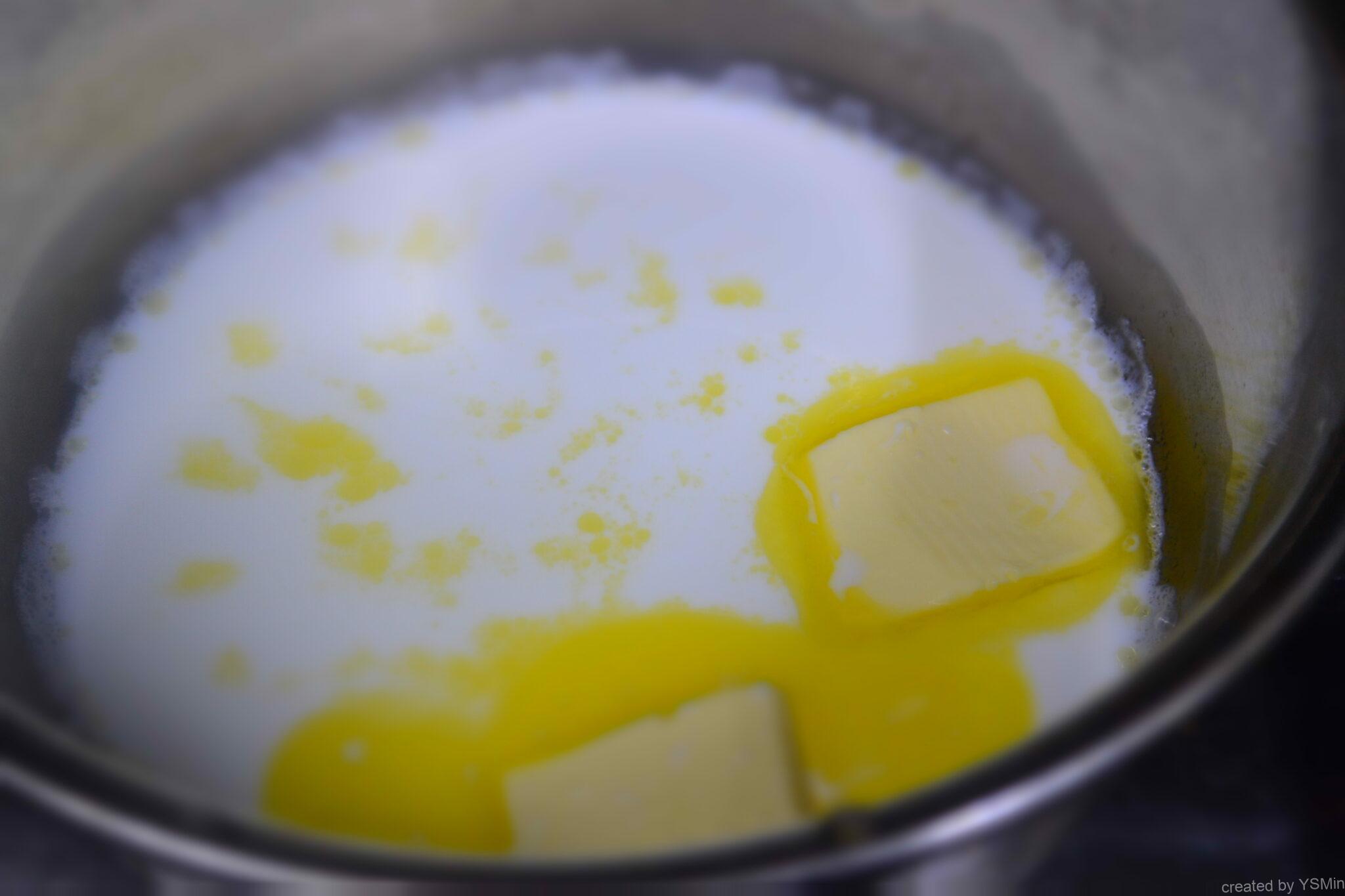 우유와 버터를 냄비에 담아 중불에서 버터를 녹여 준다. 우유 가장자리가 살짝 보글보글 거리는 정도로만 덥혀 준다.