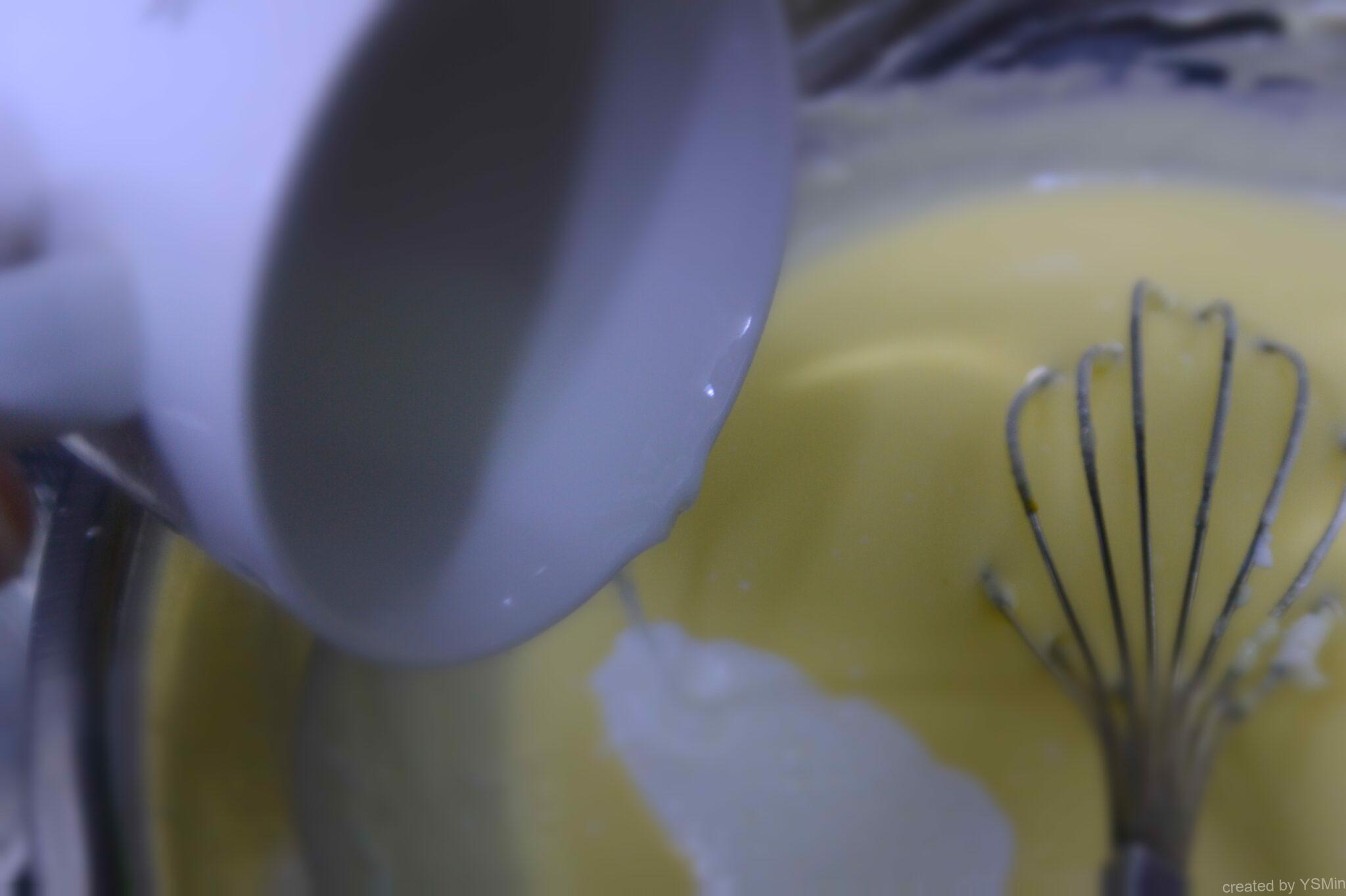 달걀 130g, 설탕 130g, 옥수수전분 30g 우유 40g 생크림 240g
