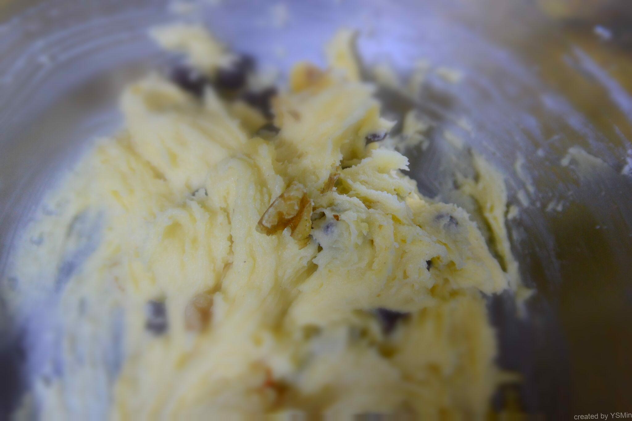 3. 초코칩, 호두, 아몬드 등을 넣고 가볍게 섞어 주고 한덩어리로 뭉쳐서 냉장고에 1시간 휴지시킨다.