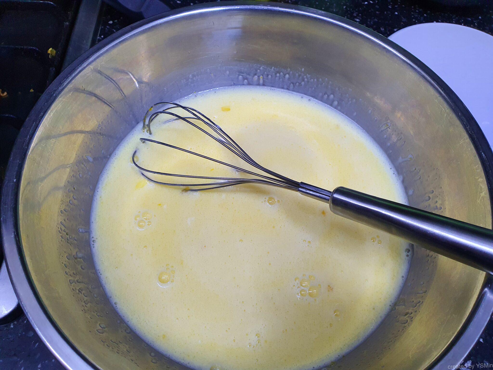 볼 그릇에 달걀과 설탕을 같이 넣고 풀어주고 살짝 끓인 우유(80도 정도)를 부어 섞어준다.