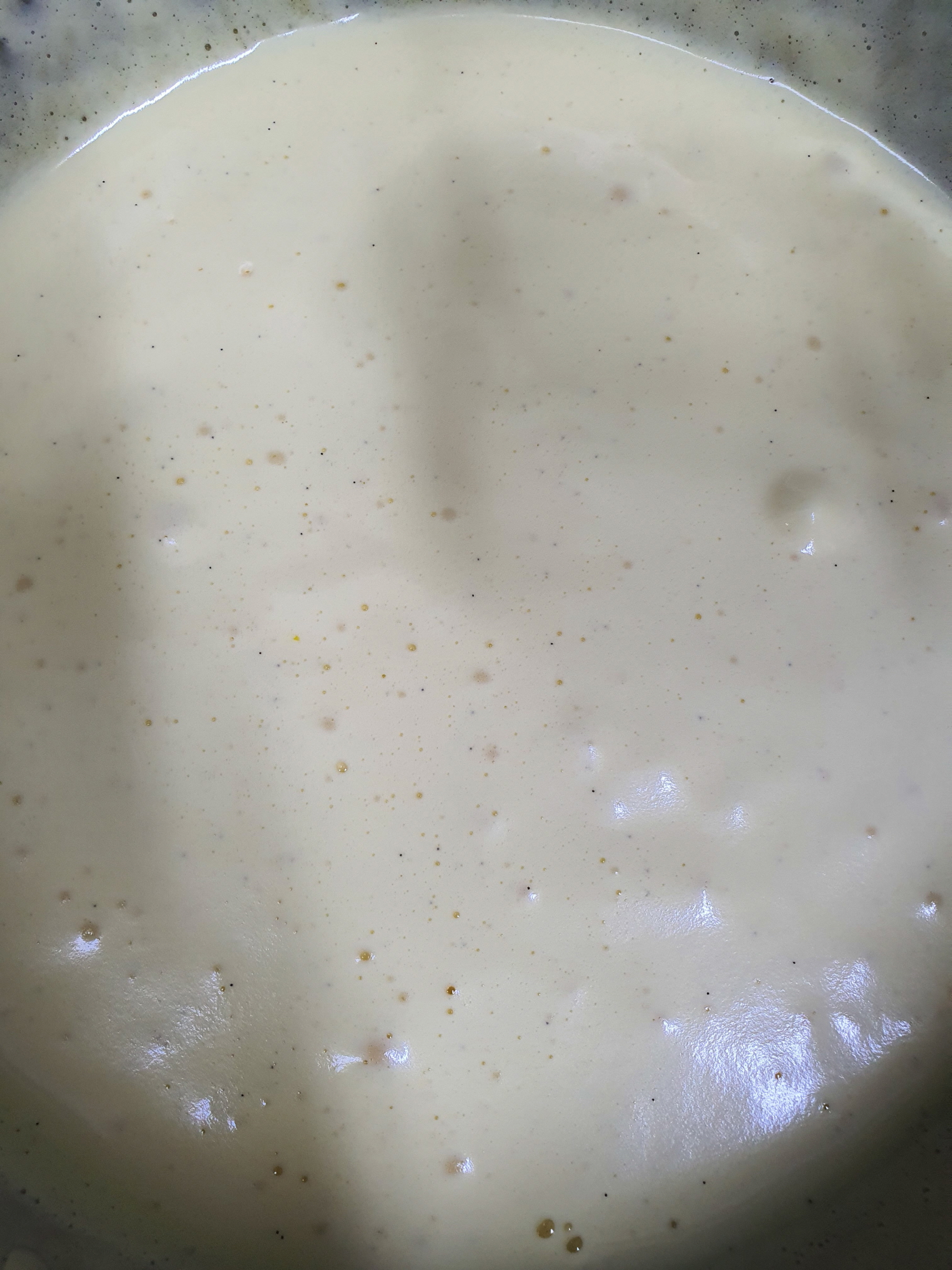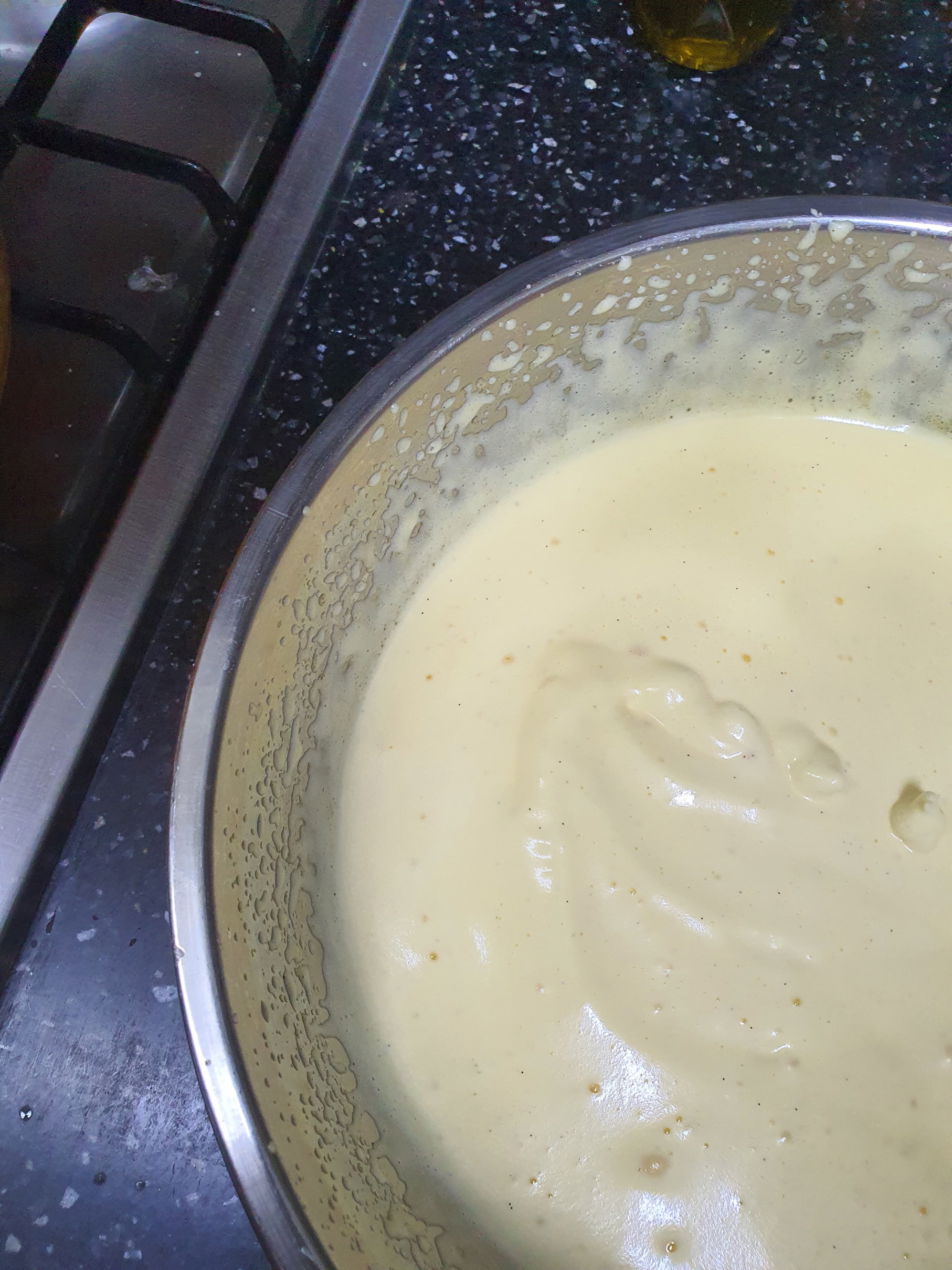계란 3개와 설탕 꿀을 한 볼에 넣고 중탕으로 재료 온도가 40도 넘지 않게 저어서 풀어주고 부드러운 머랭을 쳐준다. 박력분과 베이킹 파우다를 채에 쳐서 머랭과 섞어준다. 노른자가 들어가서인지 바닐라빈(기름기)가 들어 가서 인지 머랭이 잘 안쳐진다.